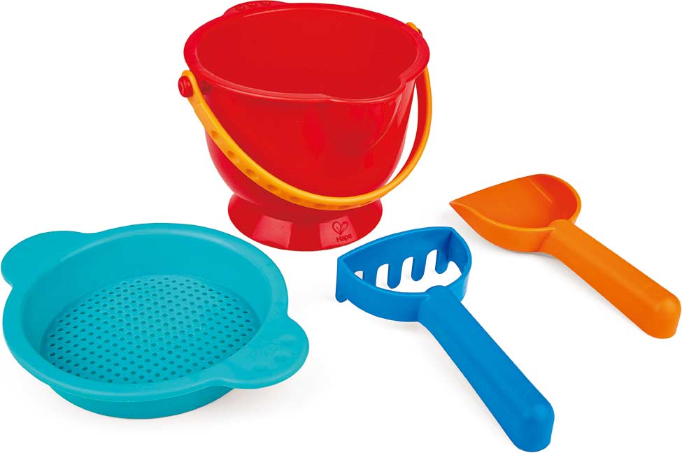 A pail, shovel, rake, and strainer. Just add sand for a perfect day at the beach.