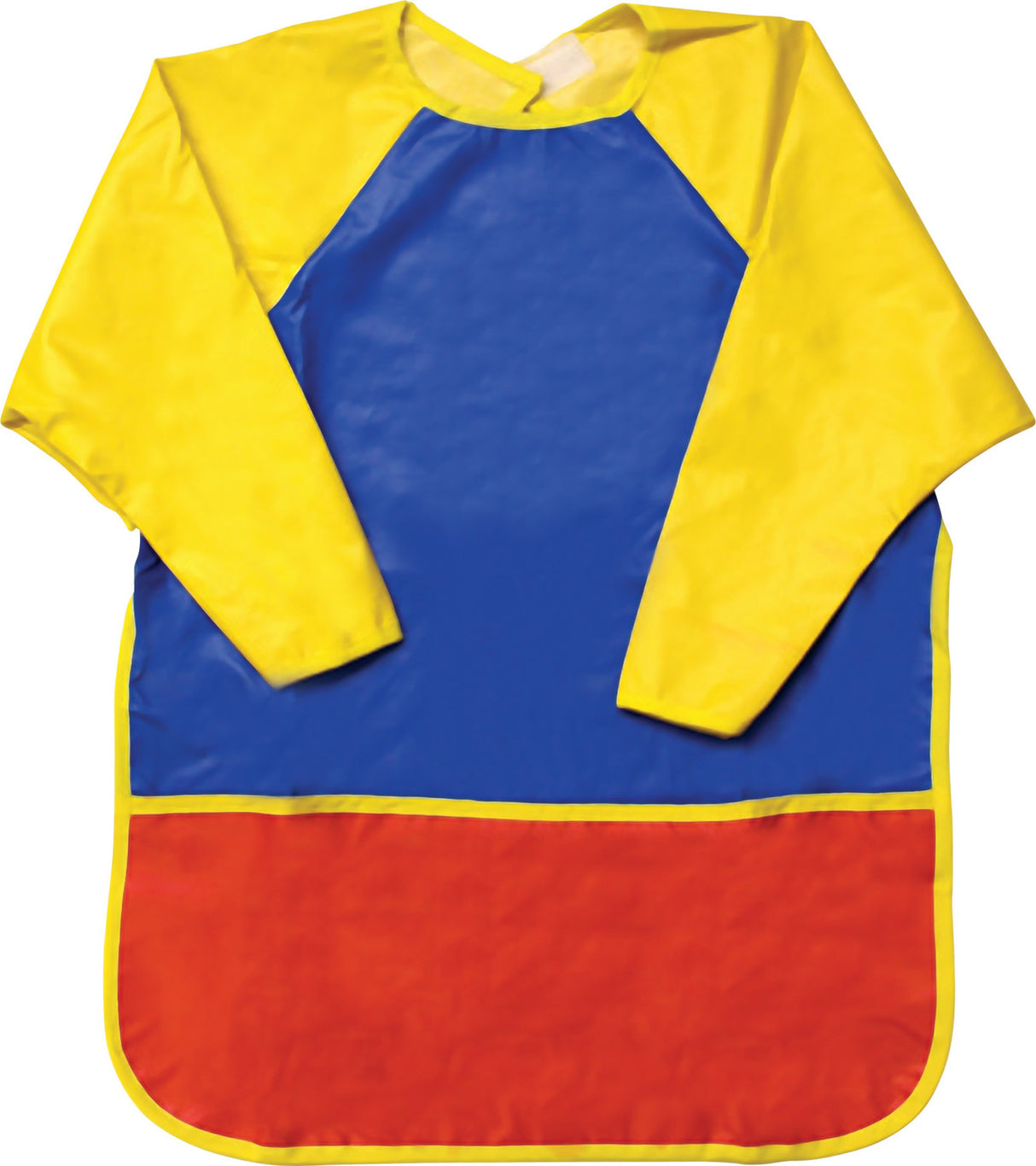 Designed for children ages 3 to 6 years of age. This smock is 22" x 18-1⁄2" and constructed of vinyl so it is easy to clean. This smock has a hook and loop closure on the back of the neck. The material offers waterproof protection for messy media.