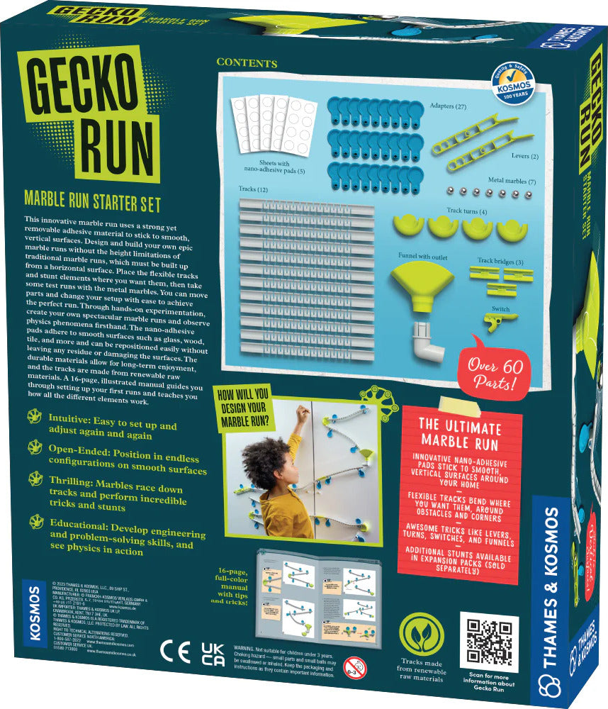 The Gecko Run Starter Set includes everything you need to zip, zag, bounce, skip, and hurdle into an awesome engineering adventure. A 16-page illustrated manual guides you through setting up your first runs and teaches you how all the different elements work. Witness physics in action! Use independently or combine with any of the expansion packs.